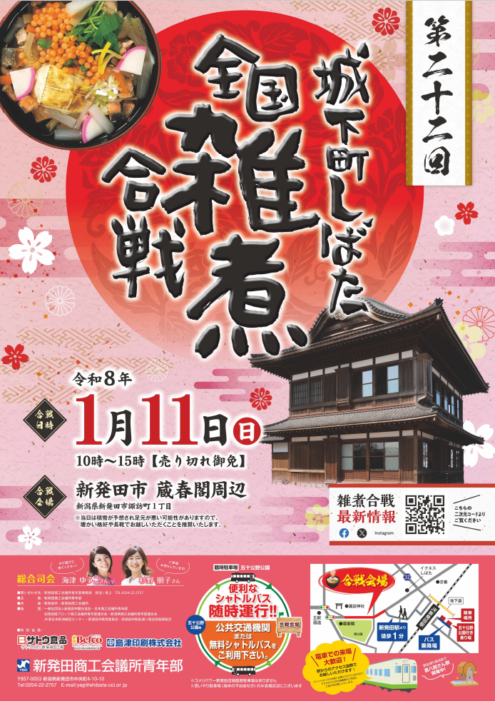 2025年12月26日 / 最終更新日時 : 2025年12月26日 admin お知らせ 1月11日(日)城下町しばた全国雑煮合戦 開催決定 日本最大級の雑煮フェス『城下町しばた全国雑煮合戦が』2026年決定第22回ともなる今回も寺町通りや諏訪神社など観光名所に囲まれた蔵春閣周辺で開催。会場には創意あふれる雑煮が終結!味わって、巡って、新発田の冬をご満喫ください!